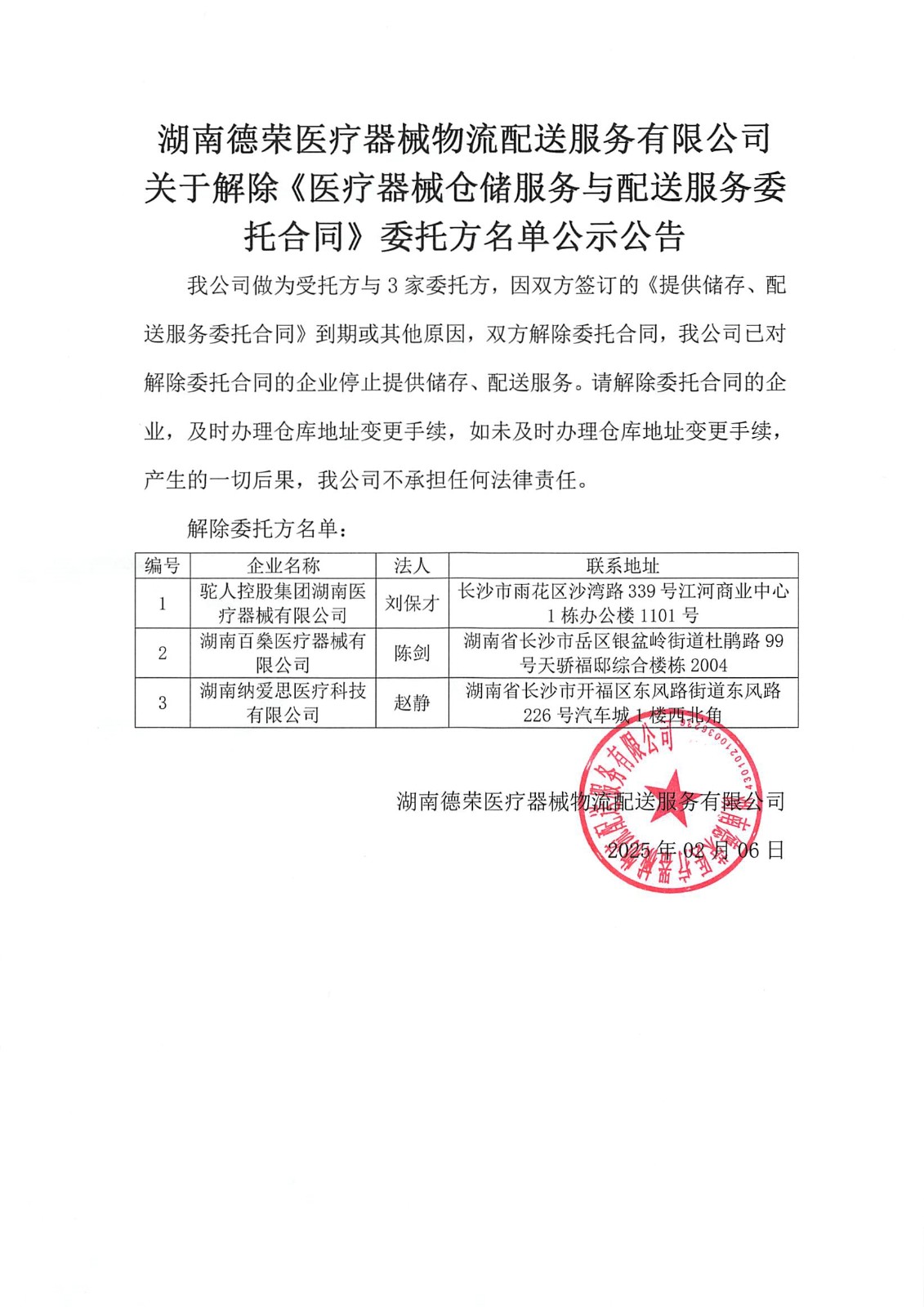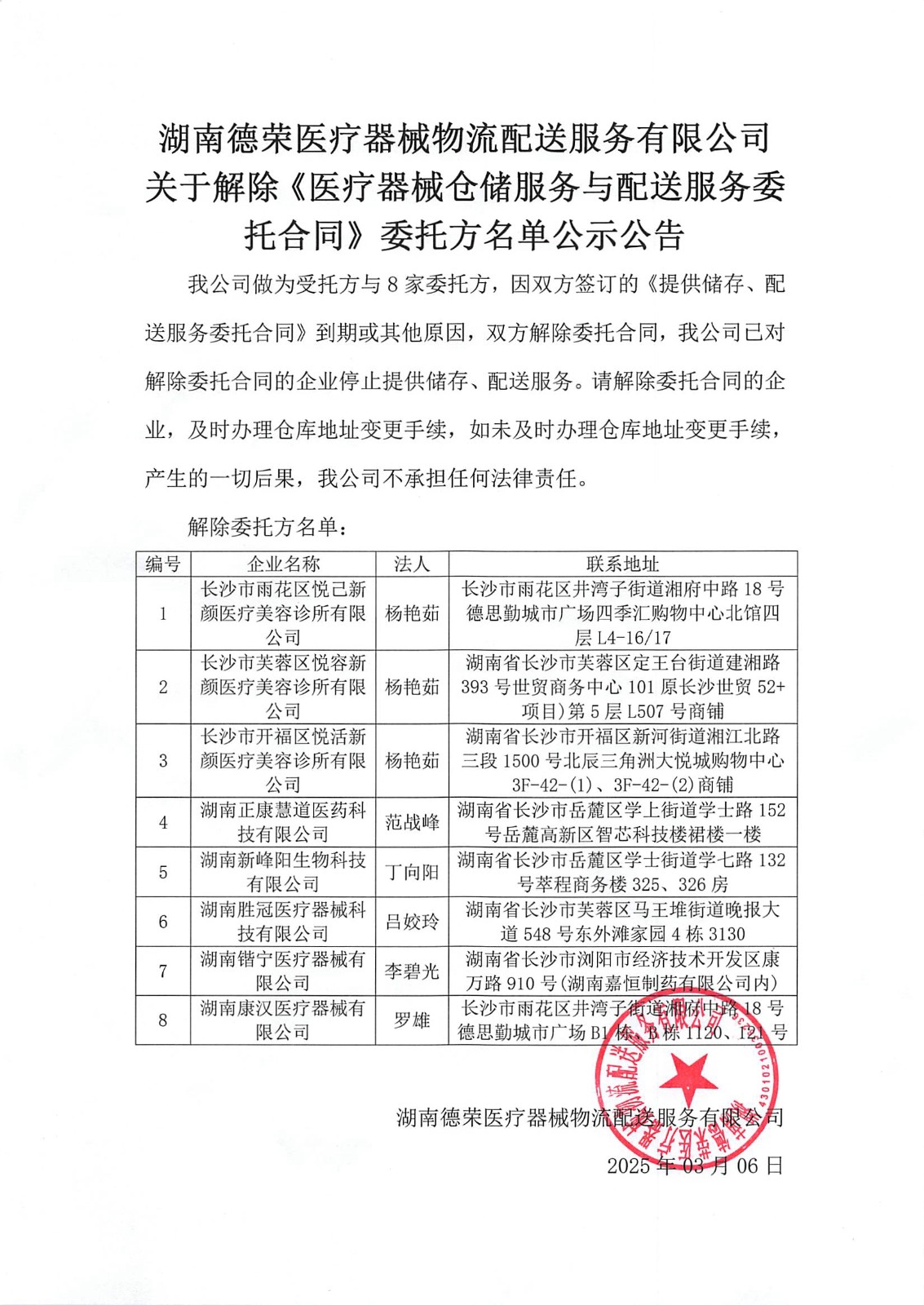 關(guān)于解除《醫(yī)療器械倉(cāng)儲(chǔ)服務(wù)與配送服務(wù)委托合同》委托方名單公示公告
